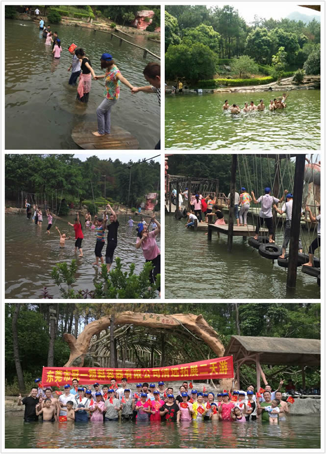 水上項(xiàng)目眾多,不來(lái)些水上運(yùn)動(dòng)真是辜負(fù)這清涼世界了。于是,歡樂(lè)的水上團(tuán)隊(duì)運(yùn)動(dòng)競(jìng)賽在鄧總的組織下拉開(kāi)了序幕。我們被分成了6個(gè)隊(duì),由各自隊(duì)長(zhǎng)帶領(lǐng)依序完成所有水上項(xiàng)目,耗時(shí)最少者獲勝。考驗(yàn)團(tuán)隊(duì)協(xié)作能力的時(shí)候到了,每隊(duì)作戰(zhàn)方式也不同。有的隊(duì)長(zhǎng)選擇帶頭走在最前面,鼓舞幫助后面的伙伴;有的隊(duì)互相牽著,攜手共進(jìn):有的隊(duì)長(zhǎng)讓膽大的男生走在前頭,自己在后面照顧婦女,膽小者。當(dāng)然,趣事多多,有50多歲的倉(cāng)庫(kù)員大叔水上連翻跟斗,老當(dāng)益壯;有小伙伴過(guò)深不可見(jiàn)的水上圓木時(shí),全身浸了個(gè)清涼,我也在此關(guān)連連被喝了幾口水;水珠飛濺,心心相連,歡聲笑語(yǔ)回蕩在山中。水中清爽之旅在我們的水中大合照中快樂(lè)結(jié)束。