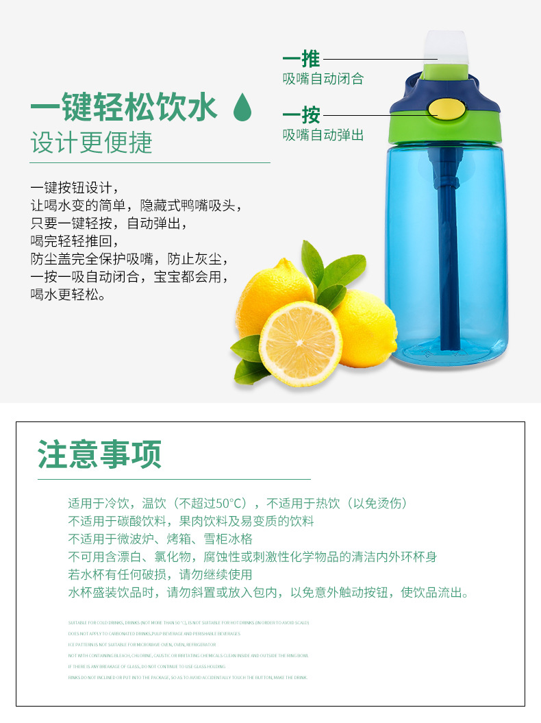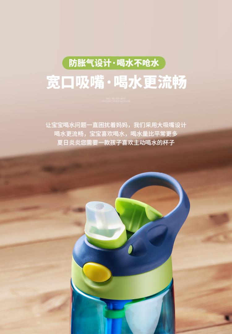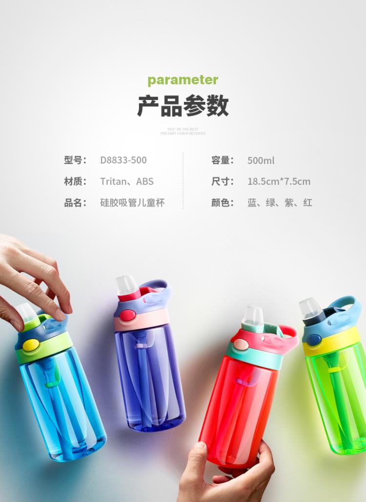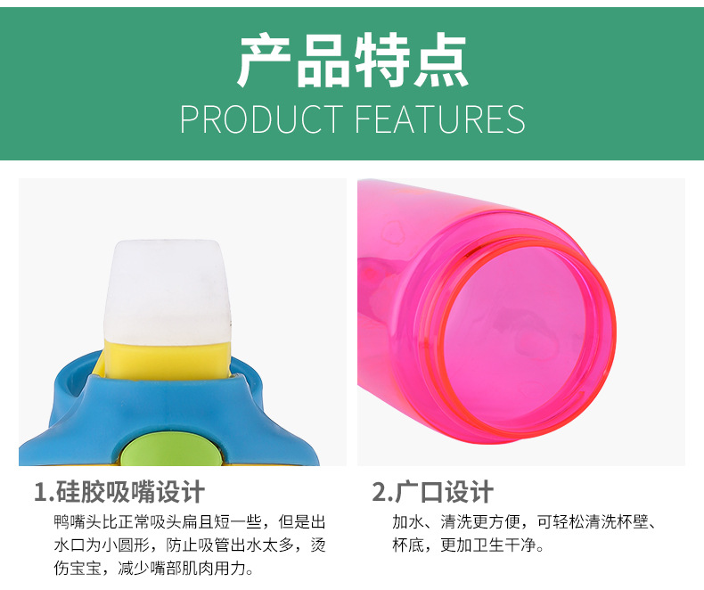 產品特點:鴨嘴式兒童吸管塑料杯,防漏防溢,安全材質,一鍵喝水,5OOML容量,多種顏色選擇,寬口吸嘴喝水更流暢